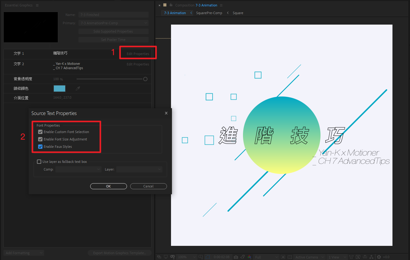 你好!如果要讓輸出的 .MOGRT 檔修改字形,可以在 AE 的 Essential Graphics 視窗內點選文字的「Edit Properties」,並將希望可以更換的參數勾選,分別為: