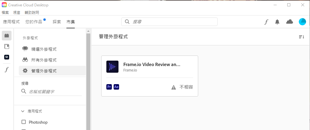 老師您好、我在Frame.io的網頁點下Free之後,creativecloud介面顯示此外掛不相容。