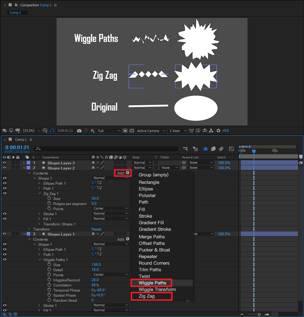可以試試看組合 Shape Layer 裡的 Wiggle Paths 與 Zig Zag 效果,就能做到和 AI 內類似的效果囉!