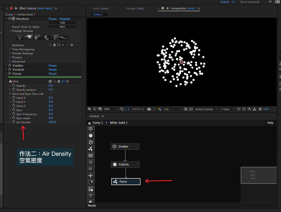 還有一個作法是連結受力節點 (Force) 至下方,並調高空氣密度 (Air Density),粒子就會在飛行過程中受到阻力影響自動變慢了!