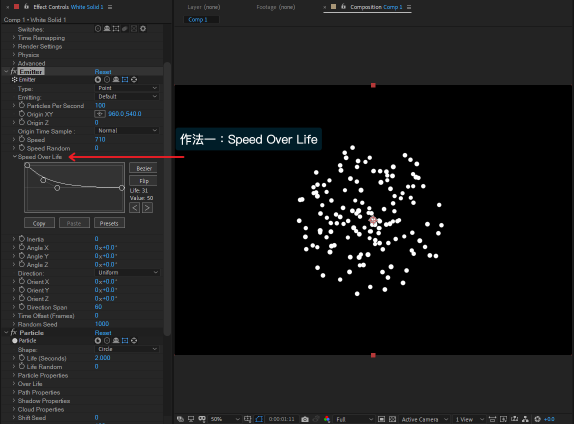可以打開發射器 (Emitter) 的 Speed Over Life 選項,並調整曲線,讓每顆粒子在生命週期內會有不同的速度變化。
