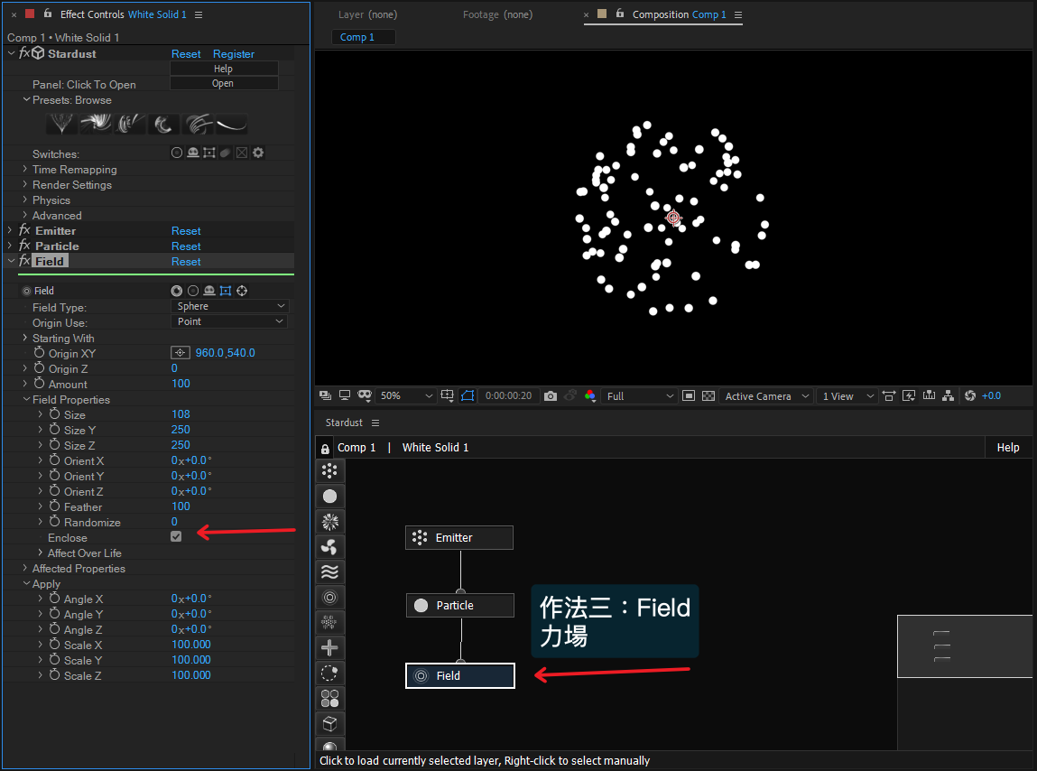 最後一種作法是連結力場節點 (Field) 至粒子下方,並開啟關閉力場 (Enclose)。這樣所有的粒子都會被包在力場範圍內無法出去,可以透過 Size 和 Origin XYZ 調整力場的位置喔!