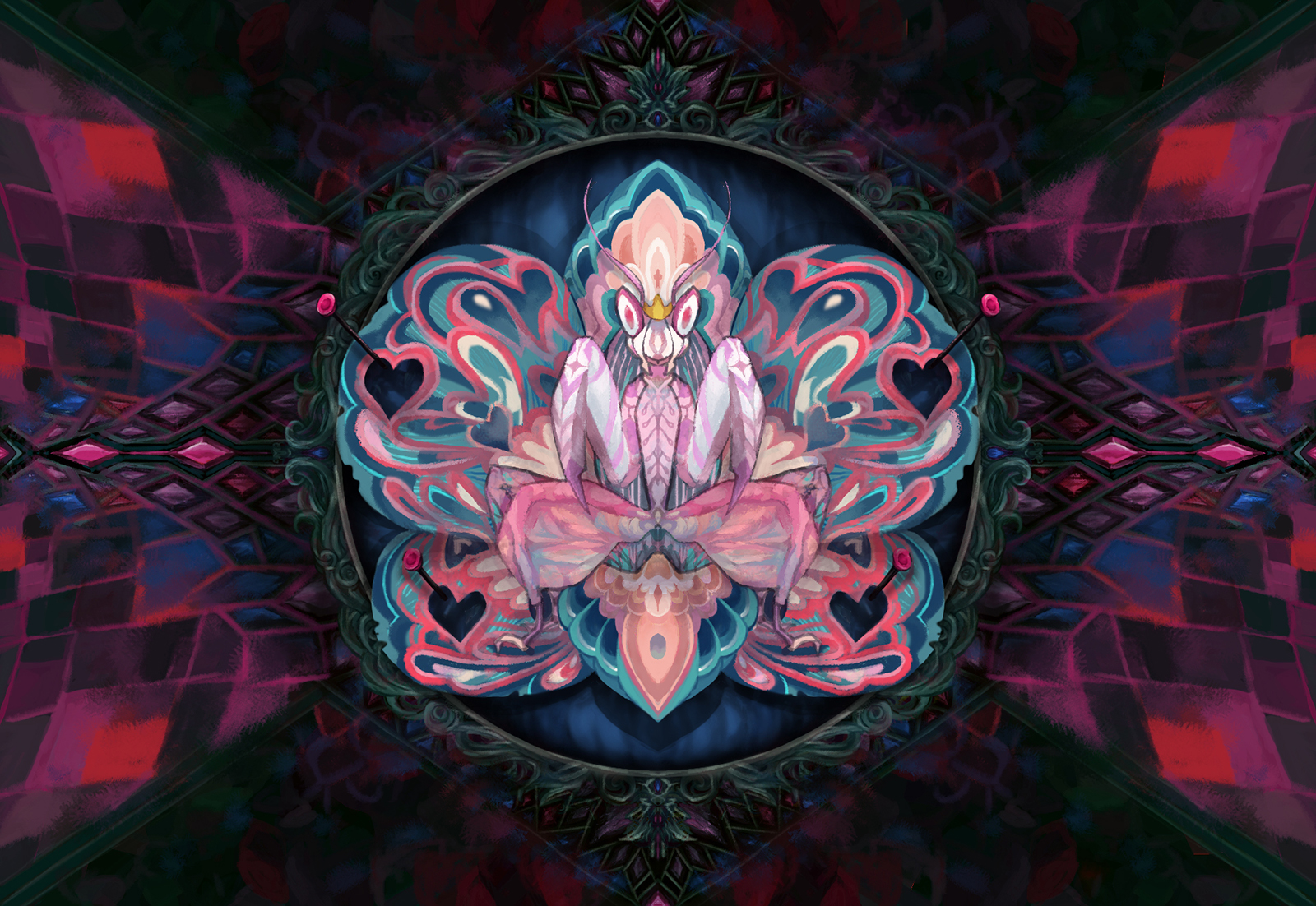 哇阿!我很喜歡您這張圖的細節~ 從螳螂的頭冠設計、手臂上的紋路、翅膀的愛心細節,還有就是背景框的設計,感覺很用心 :) 配色我也私心很喜歡!其實沒有什麼要改的,因為我覺得已經很完整了!但如果硬要說意見的話,我應該會把後腿拉長一些,把比例修改,甚至可以超過一點框做一些變化。(不過這是硬要說修改的前提啦!我自己已經很喜歡這張了~ 謝謝您願意花時間看完課程與完成作業喔 >//<