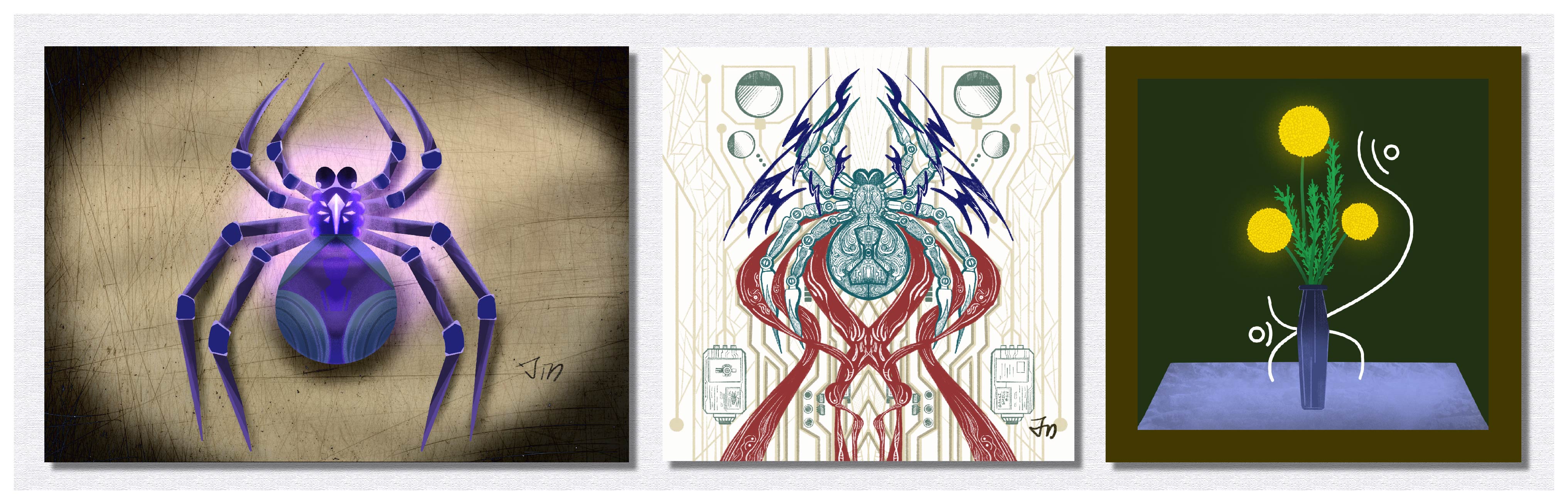 哇啊!一次畫了三張好認真!謝謝您的作業,我覺得整體看下來很棒! 從左邊的蜘蛛來看的話,氣氛營造很好,而且有感覺出來您有在嘗試線框跟色塊的結合應用。連蜘蛛腹部的部分也都有很多細節,我覺得很好。中間蜘蛛也是很多細節,而且感覺跟科技主題相關:電路板跟機械的感覺,連背景部分也有做設計,真的很用心。 最後一張也很有意境,而且也有加入光暈的細節。但這張相較前兩張反而感覺比較保守。這張如果我要改善的話,我會把白色線條的粗細變化做出來,讓畫面的層次更豐富。中間莖跟葉的選色,我也會讓他更多元一點。加上底下有個桌面,或許可以嘗試看看加個陰影,這樣畫面的前後層次會更多!但不論如何我覺得您很用心交作業,謝謝您!